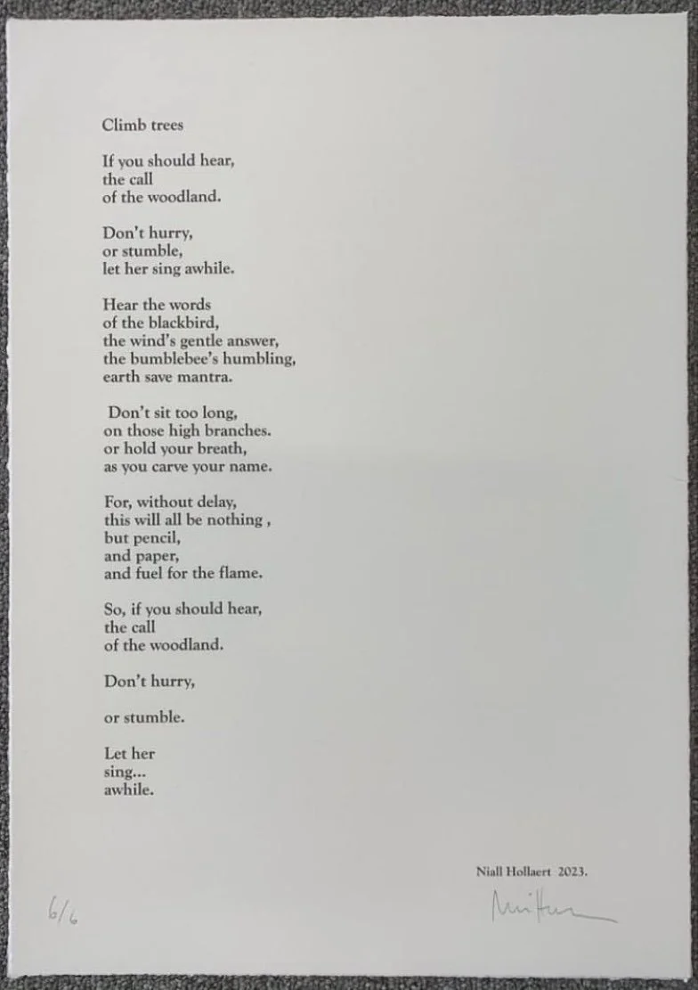 Poet Niall Hollaert has been involved with FWF with live performances and has donated his beautiful words in the poem ‘Climb Trees’, to accompany the artwork.
